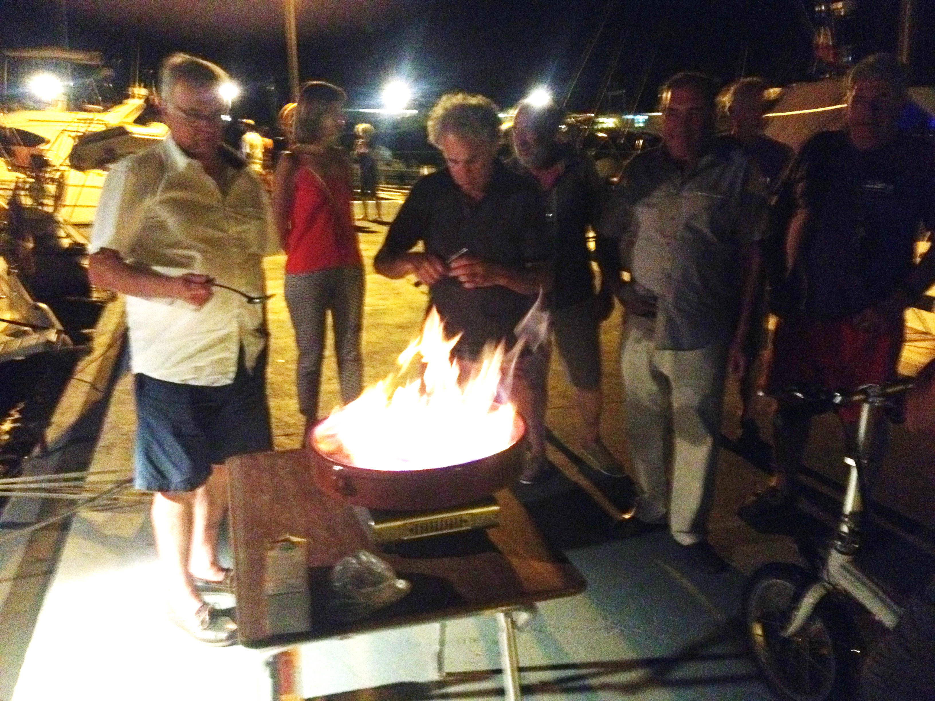 Enfin, c’est la tradition dans ce club, on peut pas terminer une soirée sans le célèbre « Cremat » sur le quai. Préparé pour une fois par Jean-Marie, pour un coup d’essai ce fut un coup de maître au dire des assoiffés présents, il fallut en refaire un autre avec une variante à base d’un élixir magique sorti d’une mystérieuse bouteille noire.
