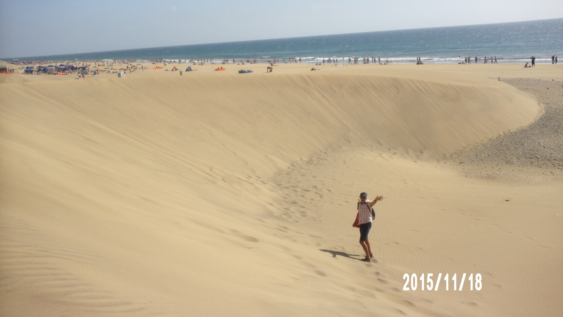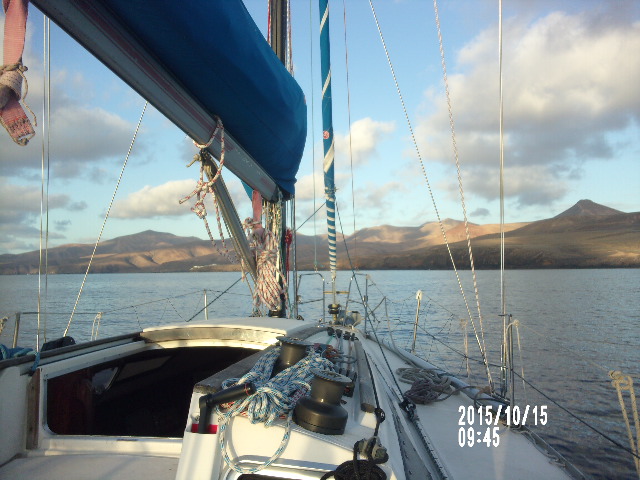 Nous arrivons aprés 5 jours et plusieurs grains dans les dents sur La Graciosa, petite île canarienne d’un autre âge, sans routes goudronnées ni voitures où la civilisation n’a pas l’air d’être encore arrivée, « là où le bon dieu a perdu les savates !… » (voir émission de Thalassa du 29 Avril 2016). Amarrage laborieux au petit port de Caleta de Sebo, toujours sans marche arrière…Puis ballade à la Playa Francesa et ses eaux turquoises. Le lendemain, sous voile, arrivée à Arrecife, capitale de l’île de Lanzarotte : tourisme et rencontre des concurrents de la Mini-Transat 2015 : Douarnenez/Point-à-Pitre en escale dans ce port. Puis, Puerto del Carmen et Puerto Calero, d’où nous louons une voiture pour visiter Lanzarote dans la journée, La Fondation César Manriqué et le Parc National de Timanfaya en autocar…Le lendemain, nous longeons la côte de l’île de Fuerteventura, longues plages de sable blanc, une nuit à l’ancre, puis partons sur Gran Canarie à la barre franche, car le pilote nous a laché…Aprés un grain particulièrement violent 39 noeuds de vent et 4 jours plus tard, nous arrivons à Las Palmas…la capitale, où nous ne trouvons qu’une place au port pour seulement une nuit, (car les organisateurs de la grande régate internationale de l’Arc Las Palmas/Saint Vincent ont tout réservé jusqu’au 22 Novembre 2015), malgré notre réservation dans ce port jusqu’au début Décembre, d’où je devais garder le bateau avec ma femme qui arrivait le lendemain en avion, pendant que mon neveu, propriétaire du bateau, rentrait chez lui pour travailler et ne revenir que le 5 Décembre pour reprendre son bateau et faire la traversée jusqu’en Martinique avec un coéquipier et moi. Donc, le soir même nous quittons le port