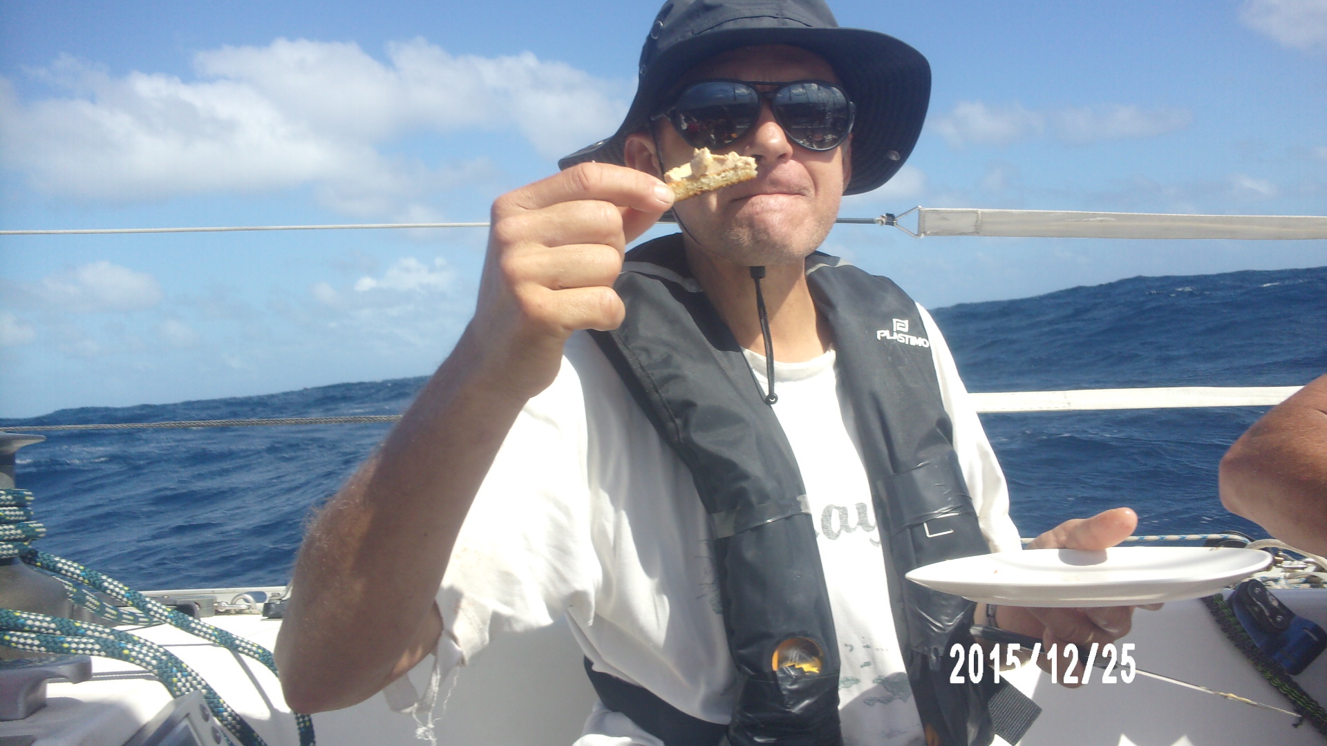 Le 6 Décembre 2015, départ pour les Antilles avec une provision de nourriture pour plus d’un mois à 3, et le produit de notre pêche au lancer…Heureusement qu’on avait aussi des boîtes de sardines au départ pour nous encourager, puis les prises de barracudas, de dorades choriphènes, de thons et de bonites furent plus nombreuses pour améliorer nos repas…