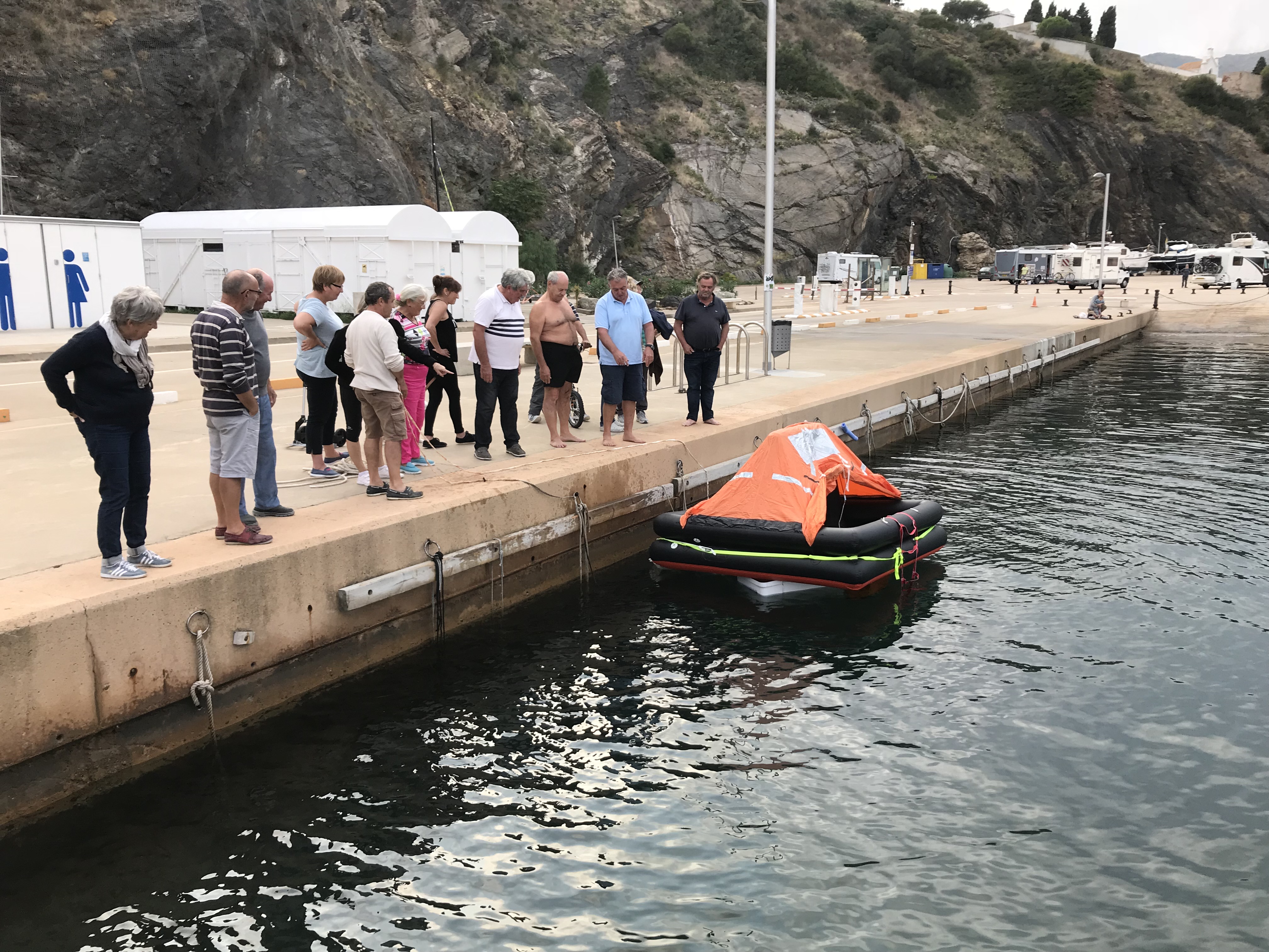 Là nous attendait une démonstration d’ouverture de survie. Une découverte pour la plupart. Pierre n’hésitant pas à se mettre à l’eau (17°) pour tester le retournement, l’accès à l’intérieur et la vérification du matériel de survie embarqué. C’est bien tranquille au port, par mer forte au large ce doit être autre chose. Mais cela donne une bonne idée du processus à suivre.