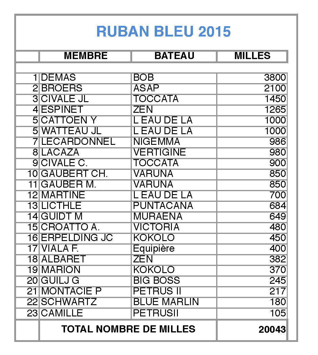 Lors de l’Assemblée Générale du Club, le Ruban Bleu est attribué au Voilier, Moteur et Equipier ayant accomplis le plus grand nombre de milles.